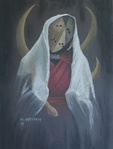 2018Een vervreemdend portret van een sjamaan uit het oude Uqbar. Soft pastel op steinbachpapier, 250 gram, A3. Eigenlijke afmetingen tekening: 38 x 26 cm.